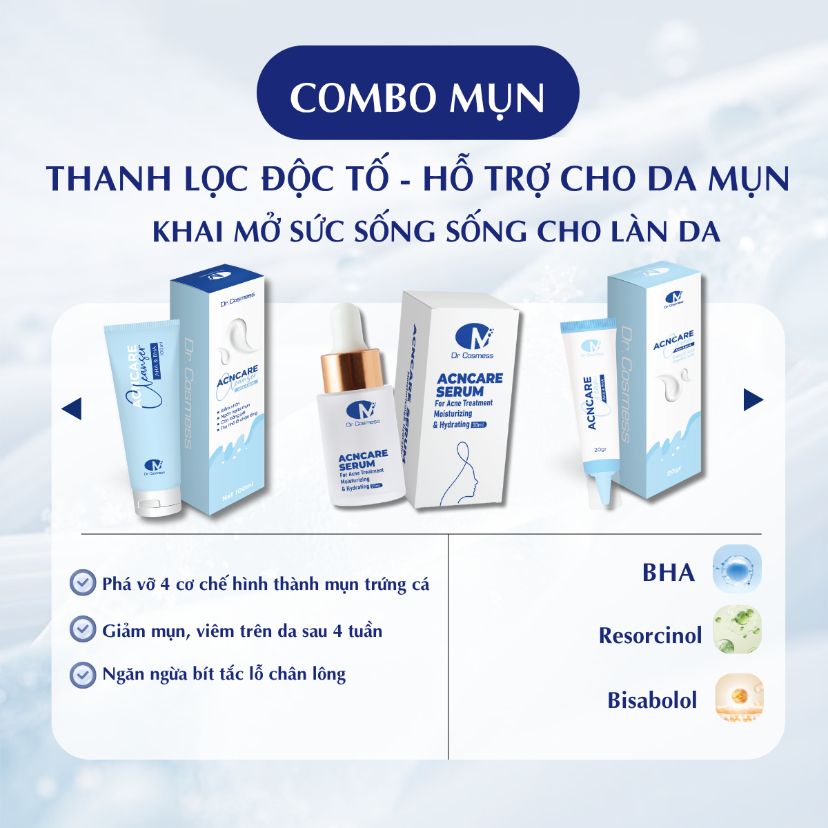 Sản phẩm trị mụn của Dr Cosmess được nghiên cứu dành riêng cho da gặp tình trạng mụn viêm, mụn ẩn hay mụn đầu đen, giúp làm sạch sâu, hỗ trợ kiểm soát dầu nhờn và hạn chế vi khuẩn gây mụn, từ đó giảm sưng đỏ và ngăn ngừa mụn mới hình thành.