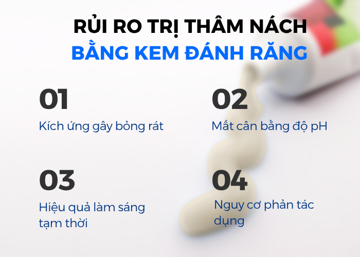 Kem đánh răng có độ pH từ 7-9, trong khi đó vùng da dưới cánh tay có độ pH từ 5-6. Nếu sử dụng kem đánh răng thường xuyên dễ làm vùng da nách mất cân bằng độ pH, vi khuẩn dễ thâm nhập và gây viêm nang lông, da không đều màu.