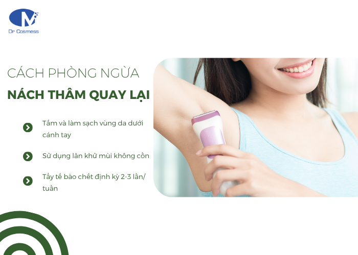 – Dưỡng sáng bằng kem chuyên biệt cho vùng nách: Để ngăn ngừa thâm nách triệt để và hiệu quả bạn nên dùng Dr Cosmess Underarm Cream trong quy trình dưỡng da hằng ngày giúp làm sáng, cải thiện sần sùi, da gà, phục hồi da sau khi cạo hoặc triệt lông.