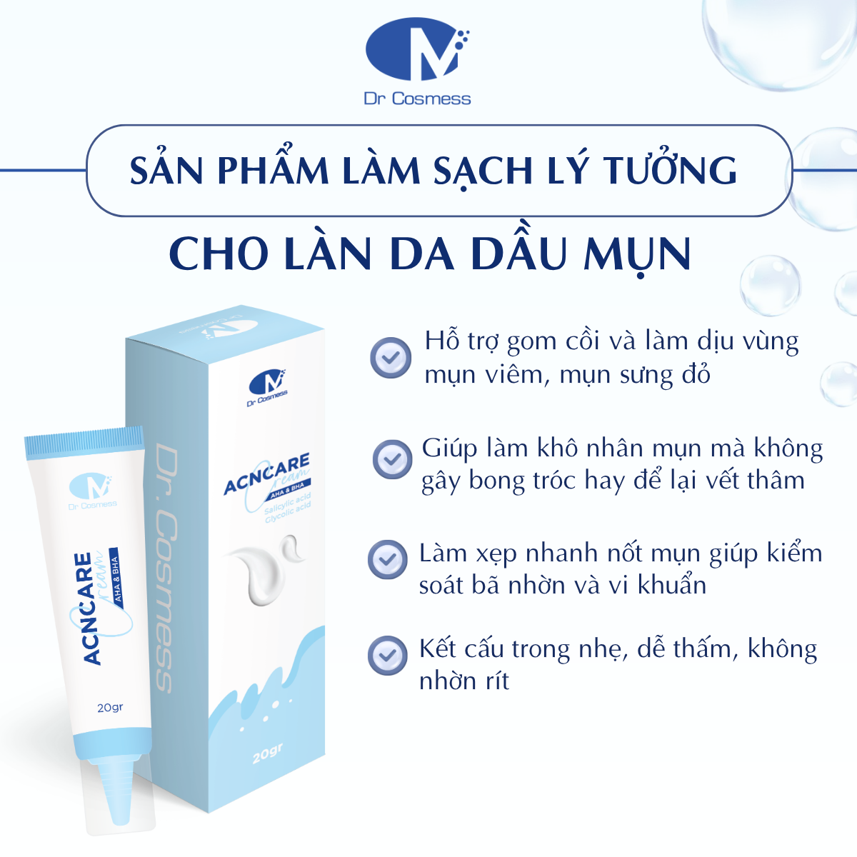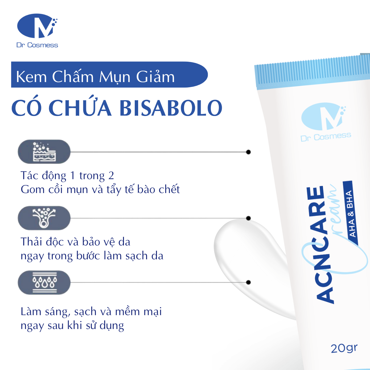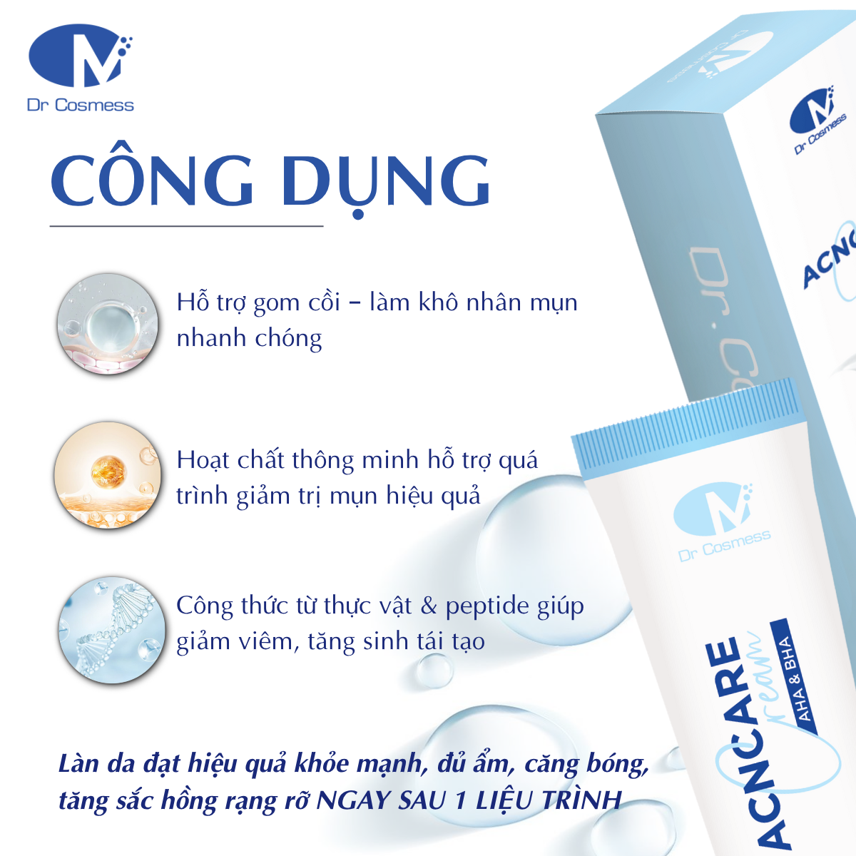 Acncare Cream là dòng kem chấm mụn chuyên sâu của Dr Cosmess, được nghiên cứu để can thiệp nhanh chóng và xử lý tình trạng mụn trên da: