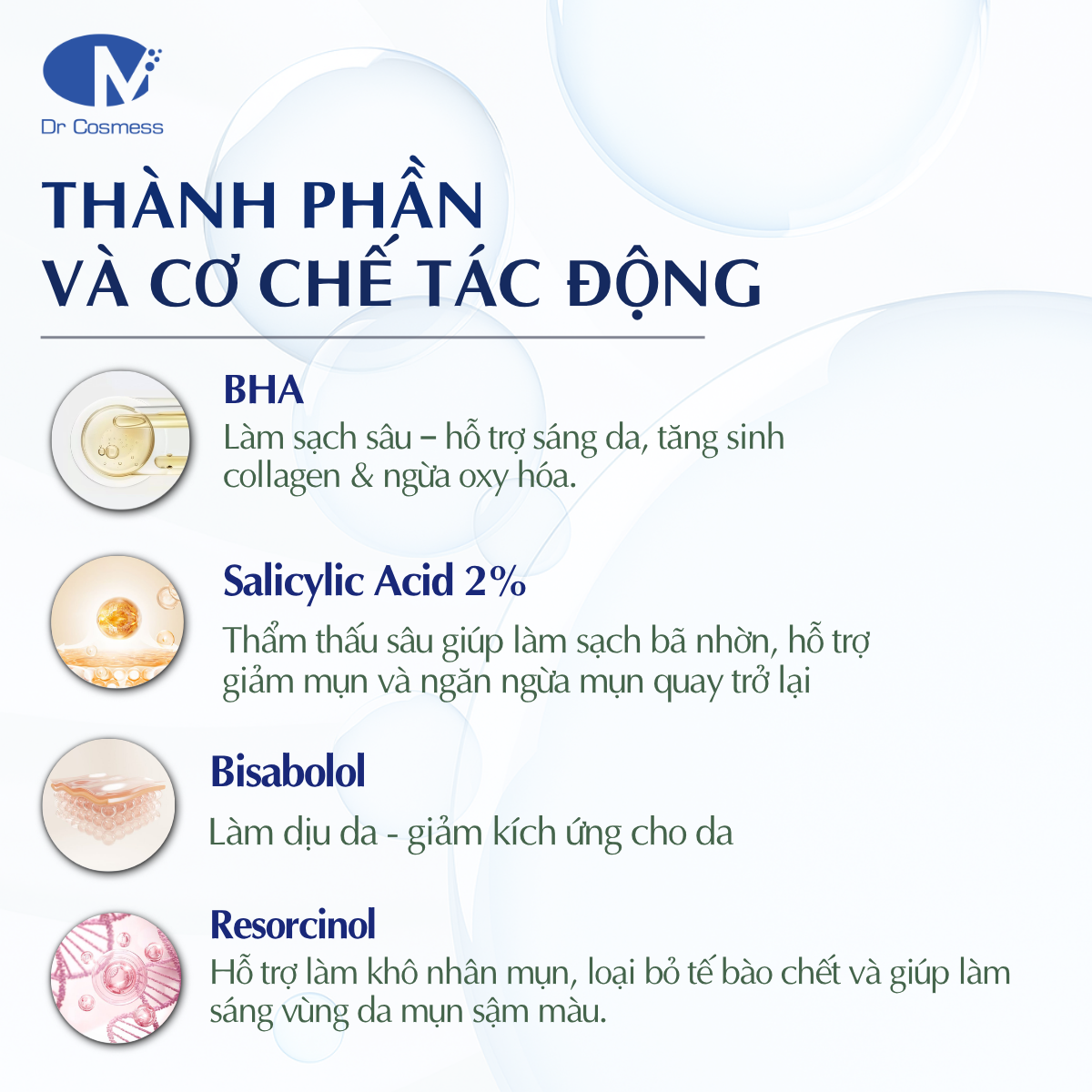 – Hiệu quả tối ưu khi kết hợp cùng sữa rửa mặt Dr Cosmess (làm sạch sâu, giảm nhờn) và Serum mụn Dr Cosmess (hỗ trợ gom cồi – kháng viêm toàn diện).