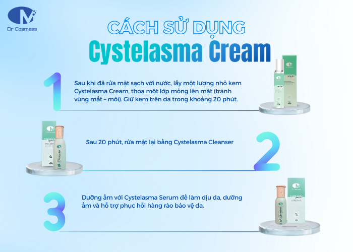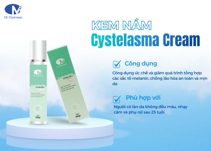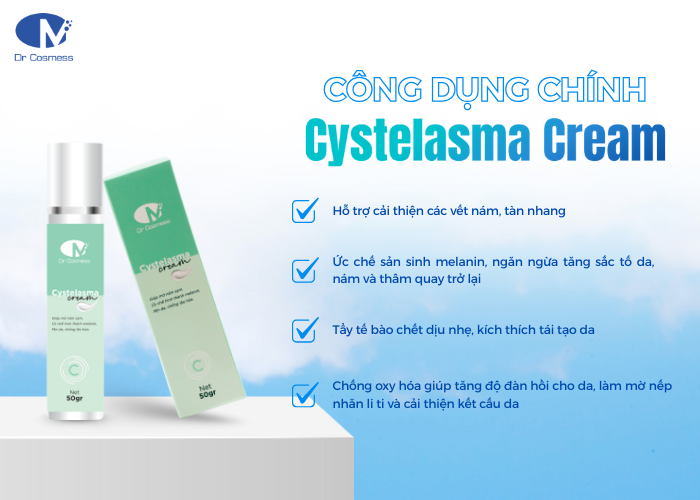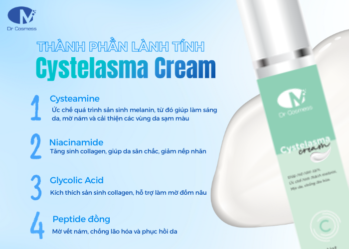 Kem nám Cystelasma Cream có chứa các thành phần Cysteamine, Niacinamide, Glycolic Acid và Peptide đồng giúp mang lại: