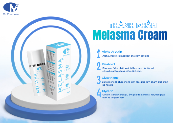 Kem nám Dr Cosmess Melasma Cream không chỉ là sản phẩm hỗ trợ cải thiện nám, sạm, tàn nhang mà còn là giải pháp giúp chăm sóc da khỏe mạnh. Nhờ sự kết hợp của Alpha Arbutin, Bisabolol, Glutathione và Glycerin, sản phẩm mang lại hiệu quả tốt giúp làm mờ nám và hạn chế tình trạng bị lão hóa da.