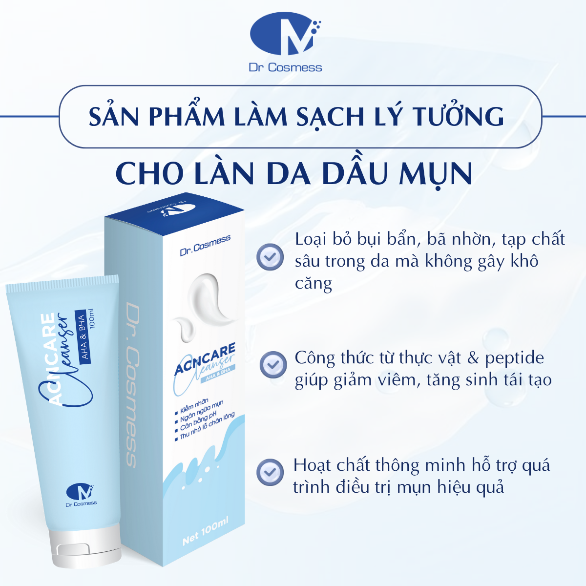 Sữa rửa mặt Acncare Cleanser được biết đến là sản phẩm trong quy trình dưỡng da hằng ngày dành cho da dầu và da mụn. Với công thức đặc biệt được nghiên cứu bởi đội ngũ R&D là các tiến sĩ, thạc sĩ và bác sĩ da liễu nhiều năm trong nghề có chứa các thành phần lành tính giúp loại bỏ bụi bẩn, làm sạch da, gom cồi mụn, kiềm nhờn và cân bằng độ pH cho da.