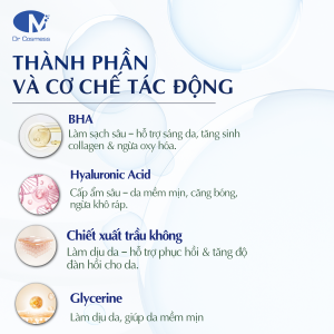 – Salicylic Acid: với khả năng tan trong dầu giúp thẩm thấu sâu vào lỗ chân lông, loại bỏ tế bào chết, bã nhờn và nhân mụn. Có công dụng giảm viêm, kháng khuẩn nhẹ, ngăn ngừa hình thành mụn đầu đen, đầu trắng giúp da thông thoáng.