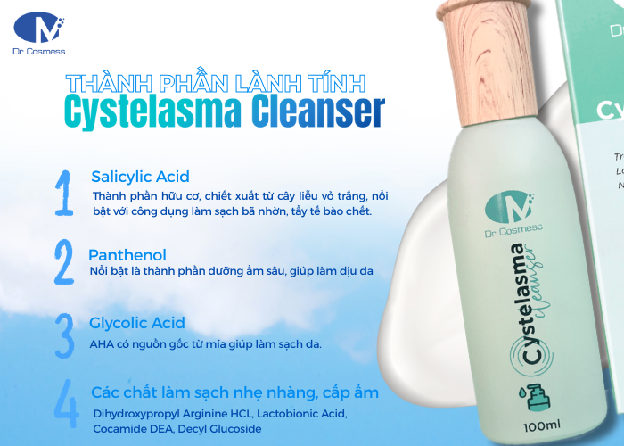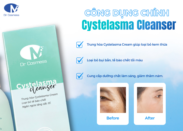 Sữa rửa mặt trung hòa Dr Cosmess Cystelasma Cleanser bảo vệ da khỏi môi trường sống ngày càng ô nhiễm khiến làn da của chị em bị ảnh hưởng gây nên tình trạng da không đều màu, nám, sạm. Không ngừng cải tiến và đổi mới, Dr Cosmess cho ra mắt dòng sản phẩm hỗ trợ liệu trình phục hồi da nám, trong đó nổi bật là sữa rửa mặt trung hòa Cystelasma Cleanser với công dụng trung hòa Cystelasma Cream loại bỏ kem thừa, bụi bẩn, tế bào chết và giúp giảm các vấn đề thâm nám do tăng sắc tố da.
